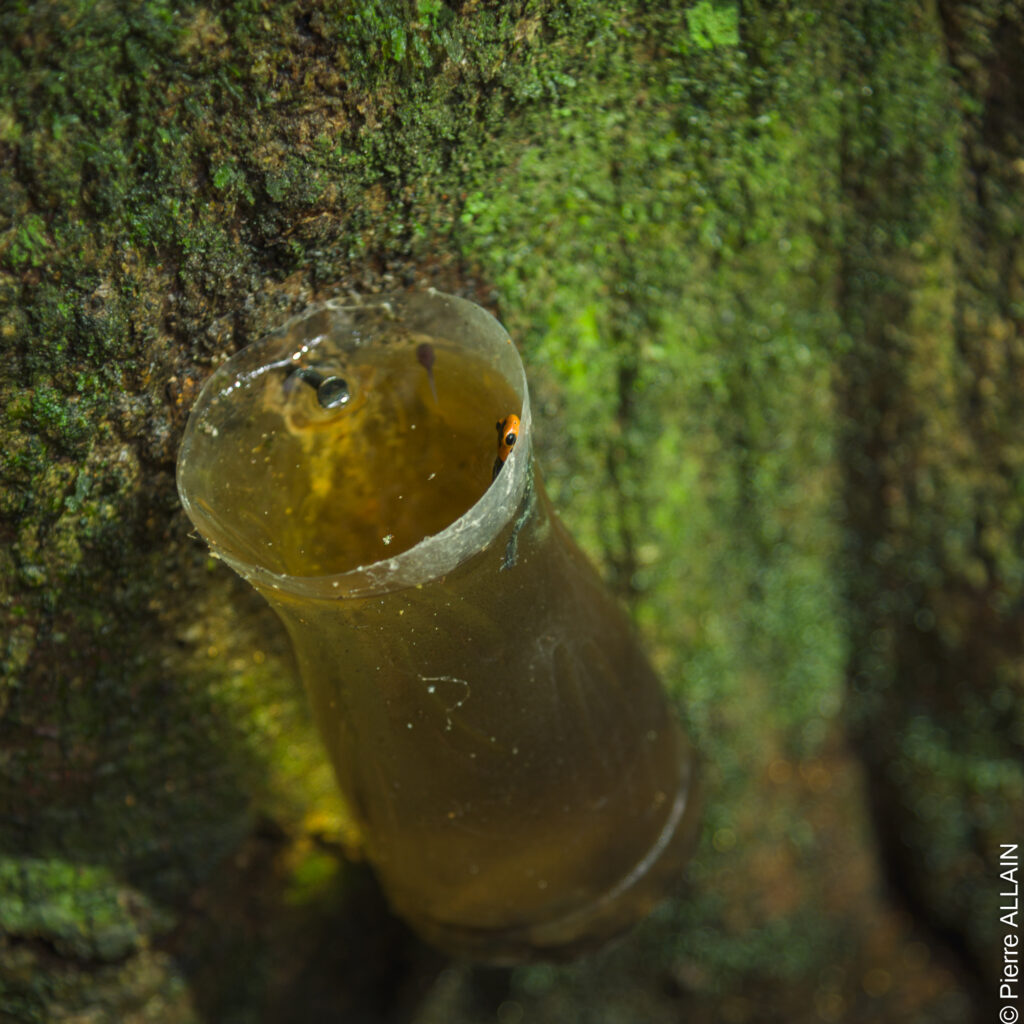 It is five o’clock in the morning when we set out toward Shapaja and Chazuta to visit the first nature reserve. During the journey, I have the chance to get to know Warren better, as he shares anecdotes about the region as well as information on the species we are about to observe. Ranitomeya and Ameerega are endemic to the San Martín region and are known for their bright colors, which serve as a warning of their toxicity (the potency of the skin secretions varies by species). These small frogs, measuring only 20 to 40 mm, thrive in humid tropical environments and hide within the dense vegetation. They use phytotelmata (small pools of water that form at the base of certain leaves) as breeding sites. An exemple of artificial phytotelmata.